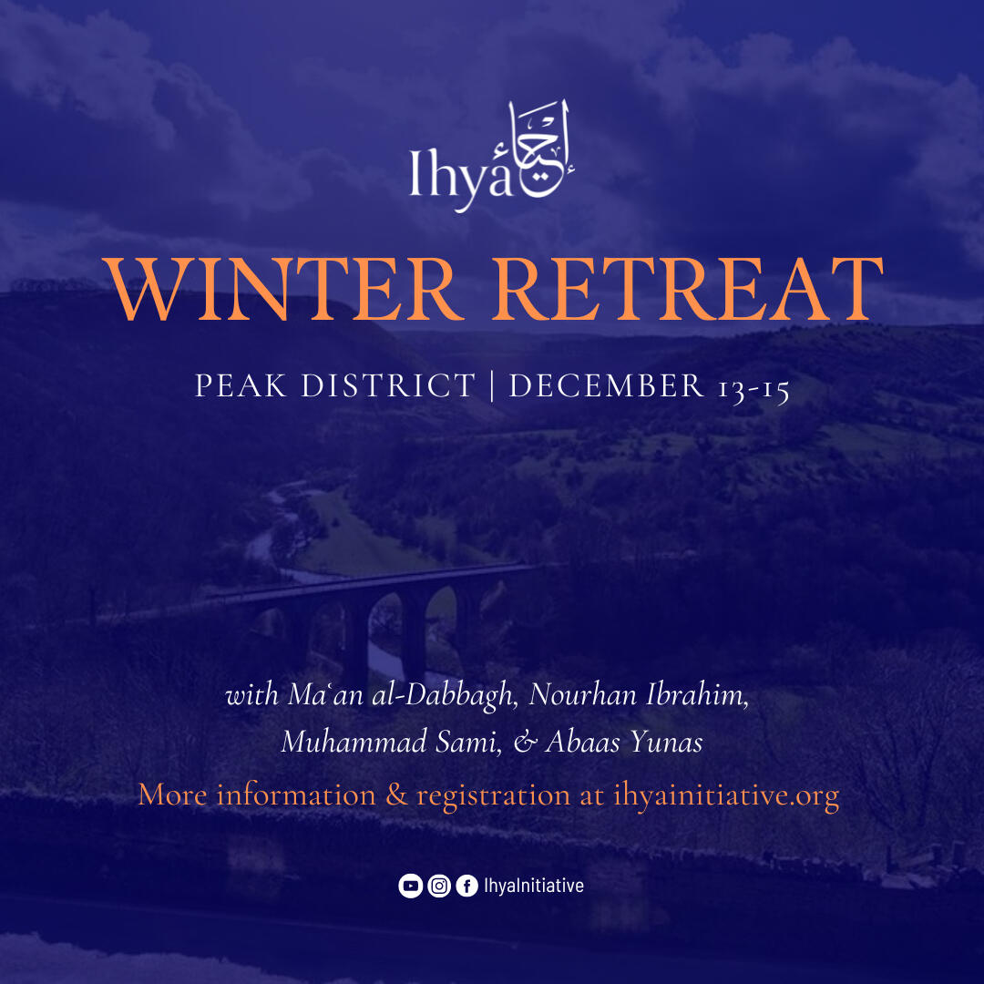 This December Ihya will hold its first winter retreat in the scenic surroundings of the Peak District in England. In this retreat we will have classes teaching classical texts on spirituality, supplementary lectures on topics that illuminate aspects of the integrality of the Islamic tradition, morning and evening adkhar (litanies), and gatherings of remembrance (dhikr) and poetry (madih).This retreat is best suited to anyone who is looking for an introduction and acquaintance to the Islamic spiritual tradition and an insight into its place within Islam and one's life more generally. For those who may already have this familiarity, the retreat offers an opportunity to build practice and solidfy foundations.DATE & TIME