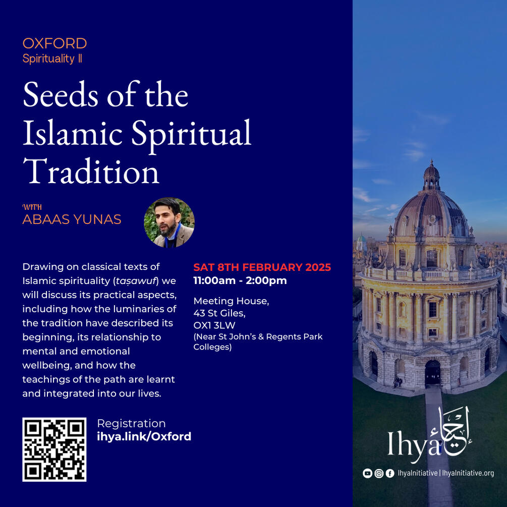 Seeds of SpiritualityDrawing on classical texts of Islamic spirituality (tasawwuf), this seminar discuss its practical aspects, including how the luminaries of the tradition have described its beginning and how the teachings and practices of the path are learnt and integrated into daily life.